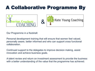 The 'Women with Impact' program is designed to develop strong, confident female leaders through personal development training, ongoing coaching, and mentoring. It addresses barriers women face in the workplace, such as lack of visibility and confidence, and emphasizes the importance of gender diversity for improved business performance. Organizations that invest in this program can expect increased retention of talented female employees and ultimately enhance their competitive advantage.