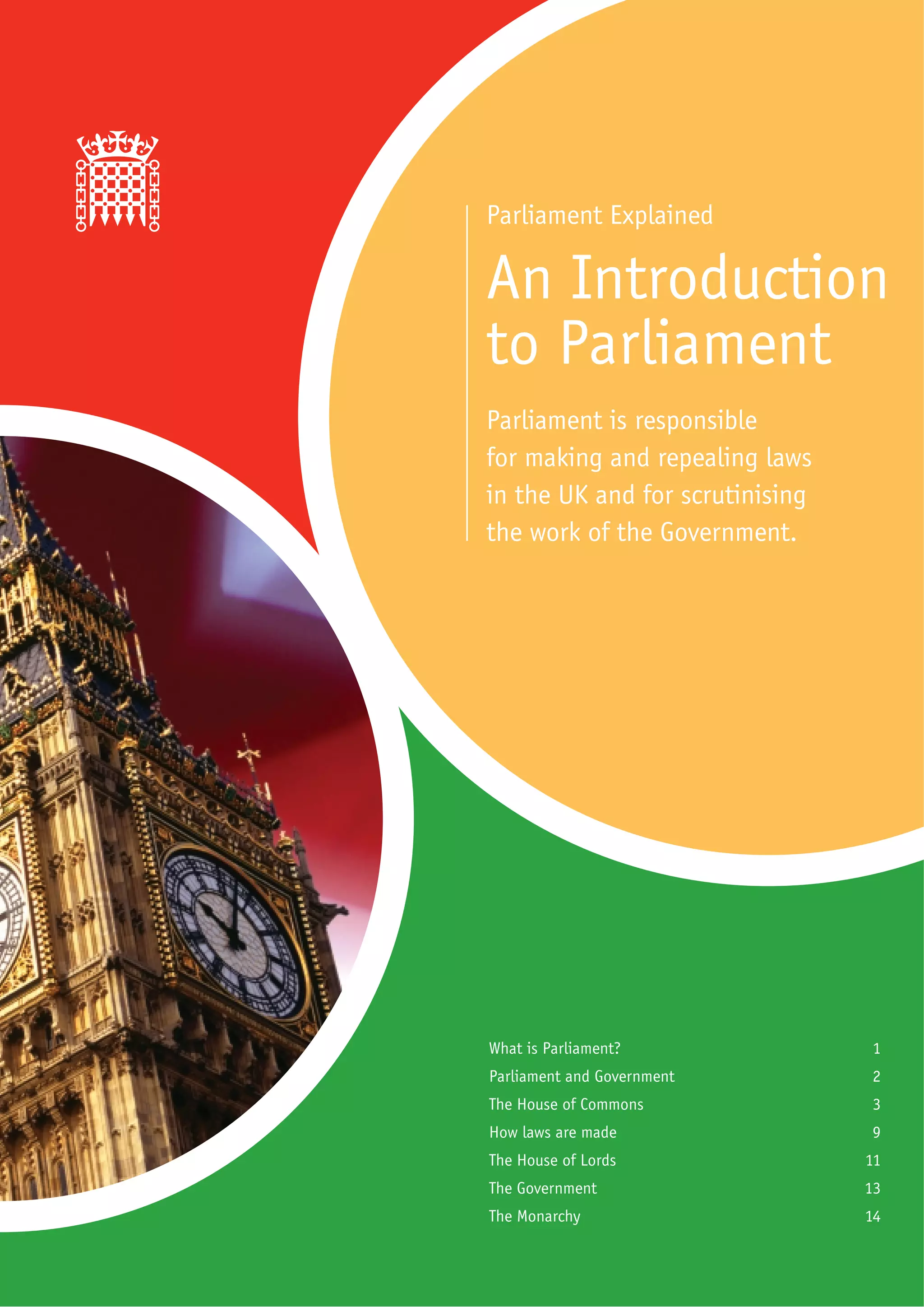 Parliament is responsible for making and repealing laws in the UK and for scrutinizing the work of the Government. It consists of the House of Commons with 659 elected MPs, the House of Lords with around 700 unelected members, and the Queen. The main roles of Parliament are to pass laws, provide funding for the government through taxation, scrutinize policies and spending, and debate important issues. Elections are held to select MPs for the House of Commons, with the party that wins most seats forming the government.