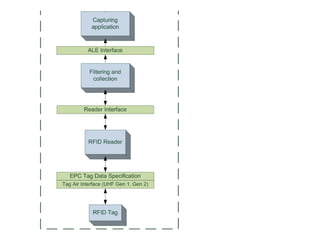This document provides an introduction to RFID technology for computer science engineers. It outlines RFID tags, antennas, and readers. It describes the different types of RFID systems based on frequency and operating range. Applications in various industries are discussed. It also touches on challenges of RFID middleware for integrating readers, security threats, and concludes that RFID allows physical objects and locations to generate automatic data as part of the Internet of Things.