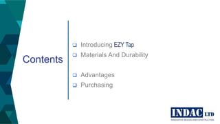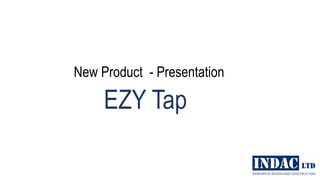 This document introduces the EZY Tap, a new product designed for low pressure piping and water tanks. It can be easily externally fixed through a rubber seal that swells when tightened to create a water tight seal. Key advantages include reducing stress on tank walls, quick and easy installation without highly trained personnel, almost no risk of damage to the product being fitted, and replacing damaged inserts. It has a recommended pressure range of 1-60 PSI and temperature range of -20 to 100 degrees Celsius. Purchase requires only a drill and hole saw for safe installation from outside the tank.