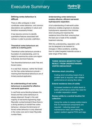 The document discusses vortex flows and their significance in solid-liquid separation, highlighting the complexity in defining vortex behavior with both theoretical and real fluid dynamics. It details the distinction between forced and free vortex behaviors, the implications of these behaviors in engineering applications, and emphasizes the importance of understanding these concepts for optimizing hydrodynamic separation systems. The text also explores how vortex behaviors can minimize short-circuiting and enhance particle residence time in various separation devices developed by Hydro International.