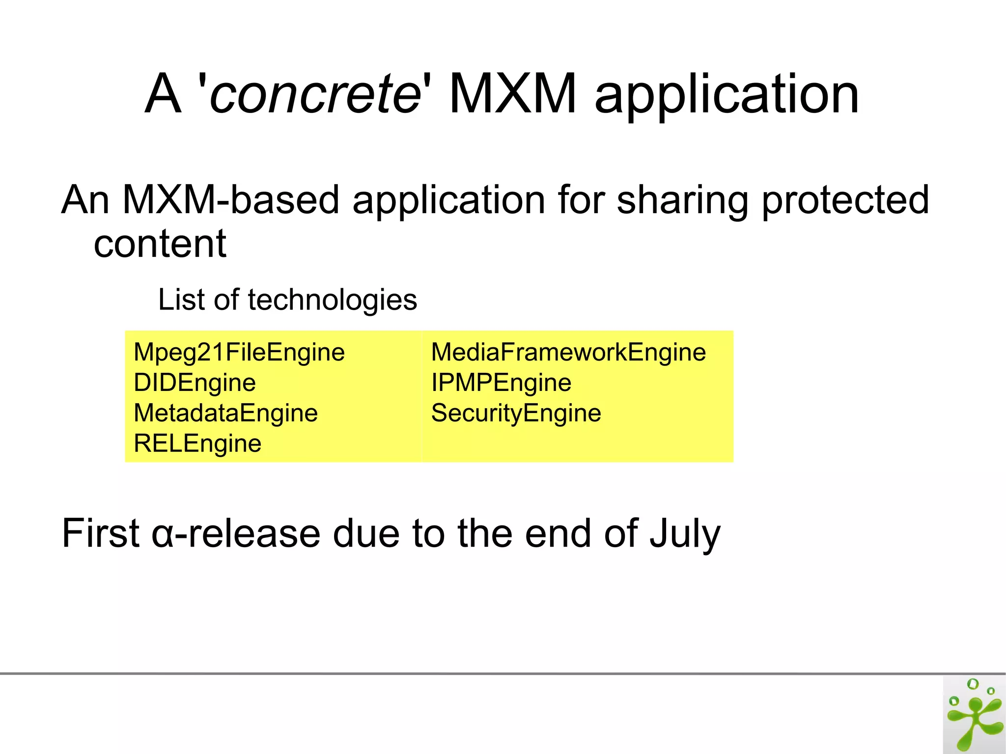 This document discusses an MXM-based application for sharing protected content. It will integrate with the chillout application for content creation and use two media frameworks, VLC and GStreamer, for playback. The first alpha release is planned for the end of July. It also provides an overview of the MXM configuration file and engine architecture, and describes how to implement a basic MXM engine and use MXM APIs.