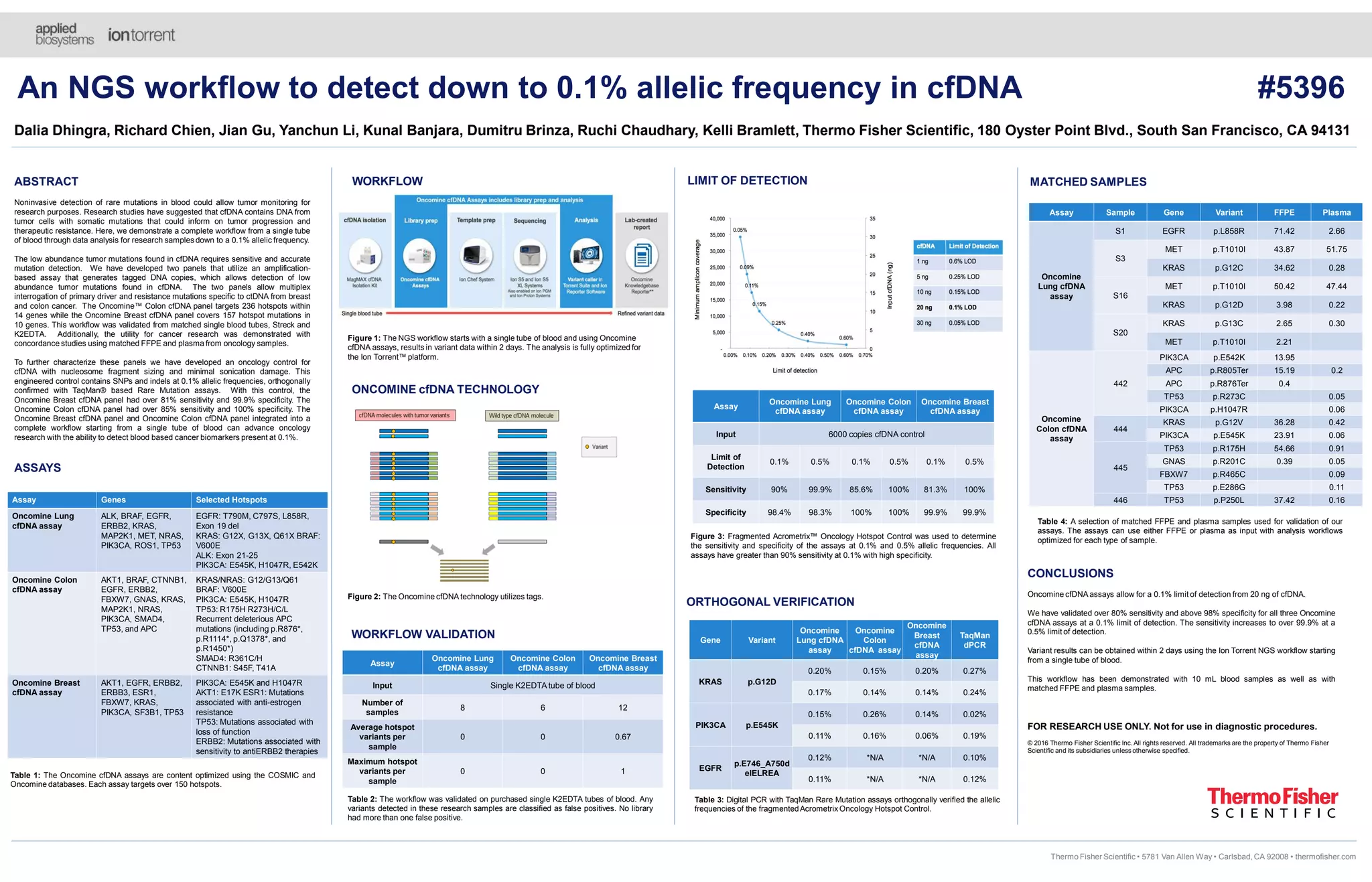This document details the development and validation of Oncomine cfDNA assays for noninvasive detection of low-abundance tumor mutations from blood samples, achieving a sensitivity of over 80% and specificity exceeding 98% at a 0.1% limit of detection. Three distinct panels were created for lung, colon, and breast cancers, each targeting specific mutation hotspots. These assays support comprehensive oncology research by enabling detection of rare mutations that may inform tumor progression and therapeutic resistance.