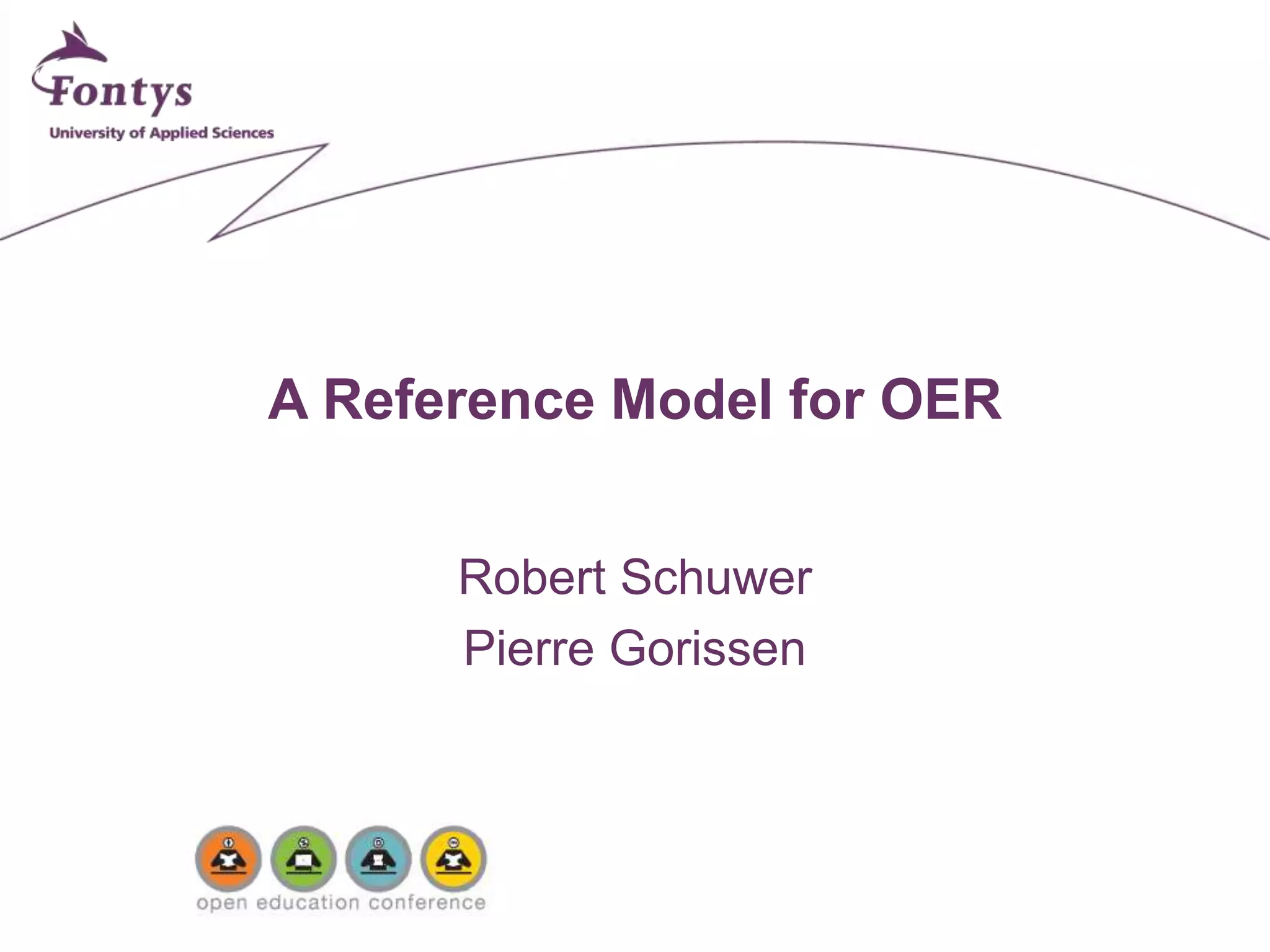 The document discusses developing a reference model for open educational resources (OER) to help address issues teachers face in finding and using OER. It proposes a two-phase model that provides basic information to get teachers started using OER as well as more advanced resources for various aspects of OER. Key aspects of OER discussed include licenses, quality, pedagogy, sustainability, and finding, implementing and producing OER. Issues that remain to be addressed include who will provide the information and maintain the reference model, who will own it, and how copyrights will be handled.
