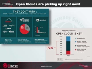 The document discusses the implementation and benefits of a software-defined storage (SDS) platform for OpenStack, specifically focusing on the OpenAttic solution. It highlights the importance of flexibility, cost savings, and the ability to avoid vendor lock-in through the use of open-source technologies in building a software-defined datacenter. Key features include support for block and object storage, as well as integration capabilities and intelligent data management functionalities that optimize storage resources.