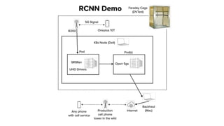 This document provides an overview of a reproducible cloud native 5G node (RCNN) project. It discusses what 5G and RAN are, explains the benefits of a cloud native approach, and outlines the components needed to run an open source 5G node, including a Faraday cage, 5G core, radio, and compatible phone. It then demonstrates installing and running the RCNN, which includes Open5GS and SRSRan, on Kubernetes. Potential uses of the RCNN are discussed, such as experimenting with different bands and testing interoperability.