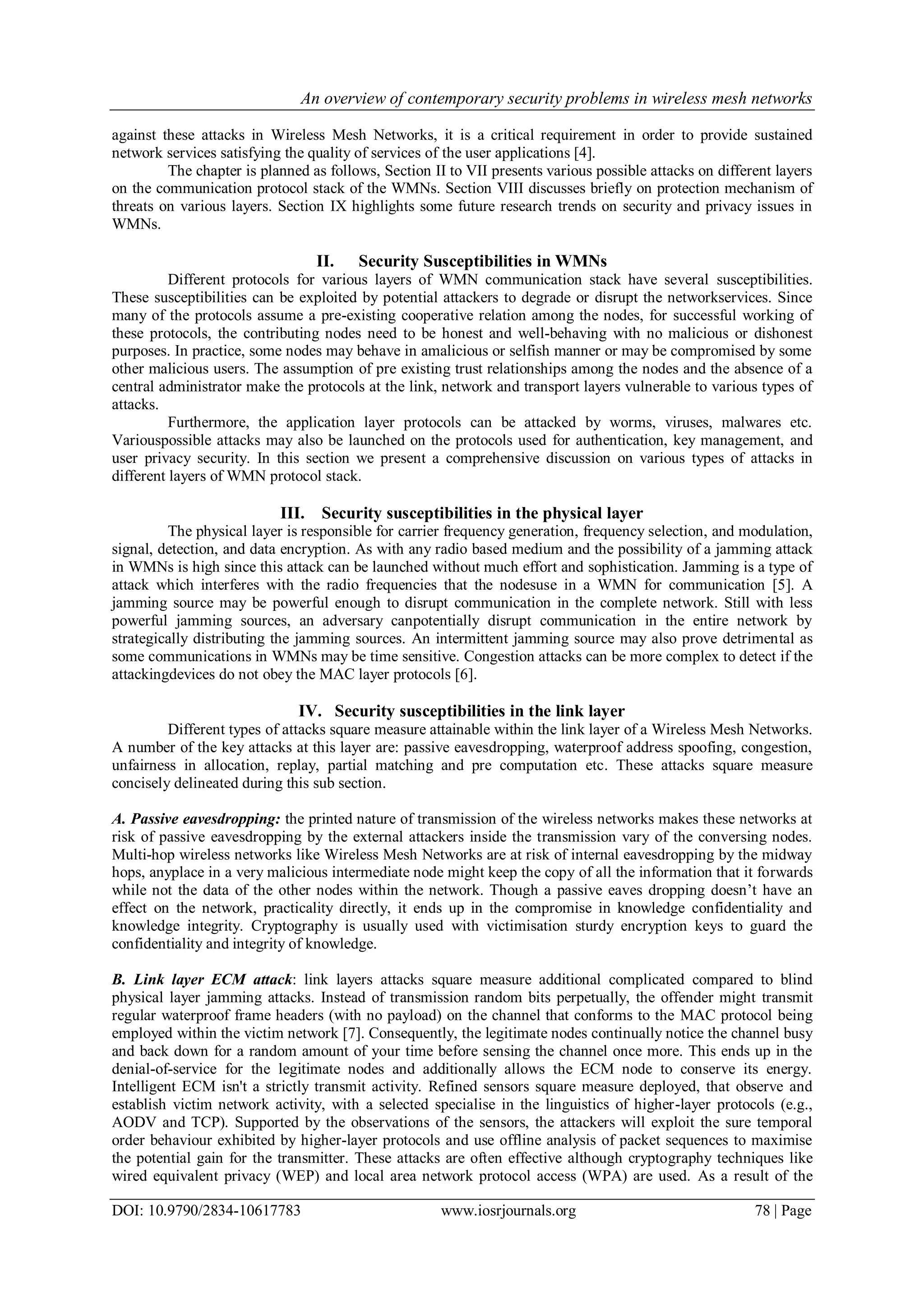 The document discusses the contemporary security challenges faced by Wireless Mesh Networks (WMNs), which are increasingly adopted for wireless connectivity. It highlights various vulnerabilities across different protocol layers that can be exploited by both external and internal attackers, impacting network performance and user service quality. The paper also suggests a need for effective communication protocols to secure WMNs against identified threats.