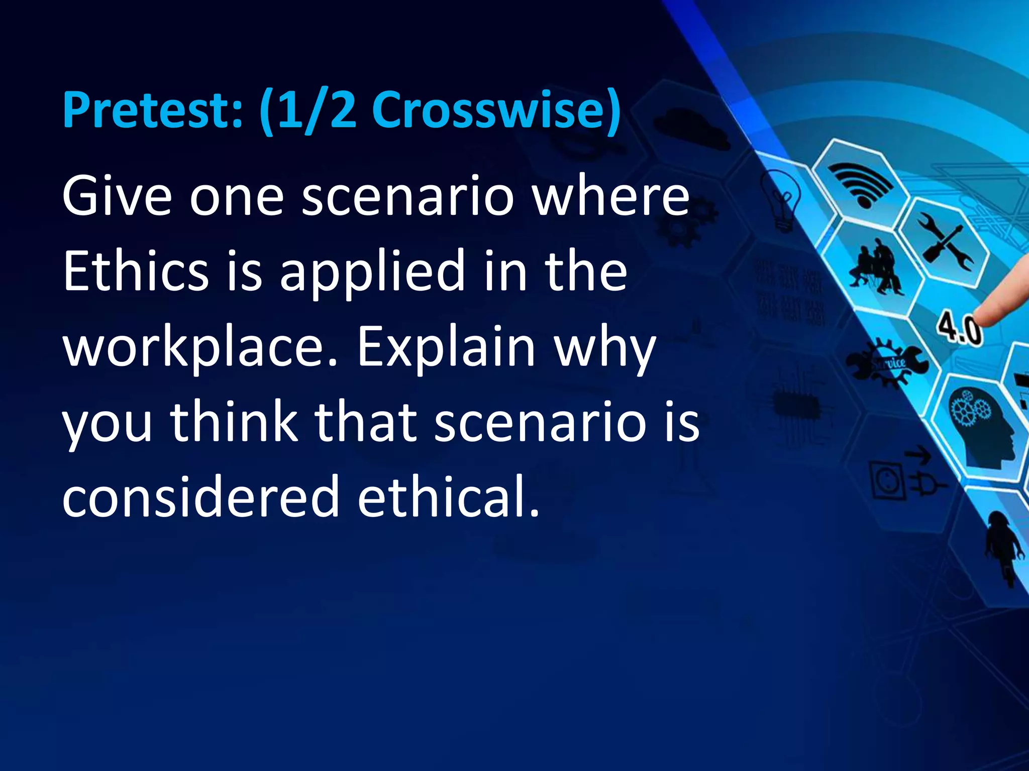 This document provides an overview of ethics. It discusses how ethics is a set of beliefs about right and wrong behavior within a society. It outlines Cisco's commitment to ethics in their business operations. Cisco provides ethics training to employees and encourages volunteering. The document also discusses how organizations should balance social responsibilities with their primary mission. It examines ethical decision making approaches like virtue ethics and utilitarianism. Finally, it covers concerns about ethical use of information technology like monitoring employees and hacking databases.
