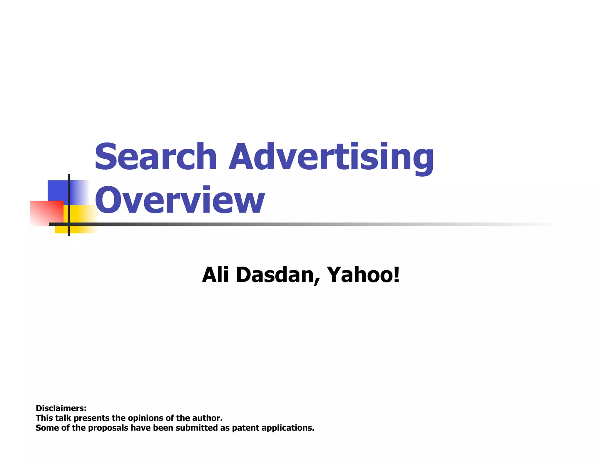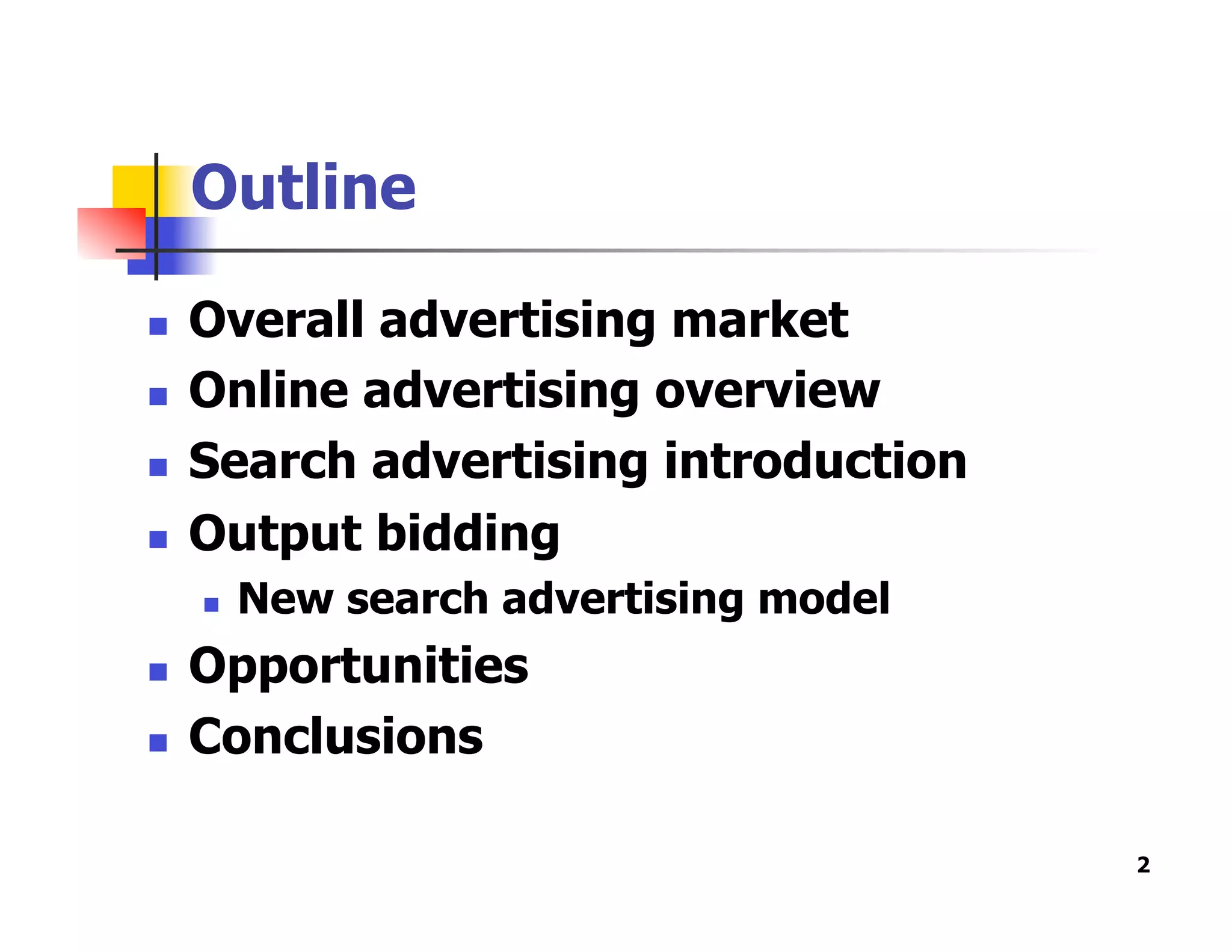 The document presents an overview of search advertising, including the evolution and mechanics of online ads, keyword advertising history, and the concept of output bidding. It discusses the importance of context, stakeholder roles, and performance measures in online advertising, while also suggesting new models for enhancing ad relevance and targeting. The conclusions emphasize the emerging challenges and opportunities in the field of web search and advertising.