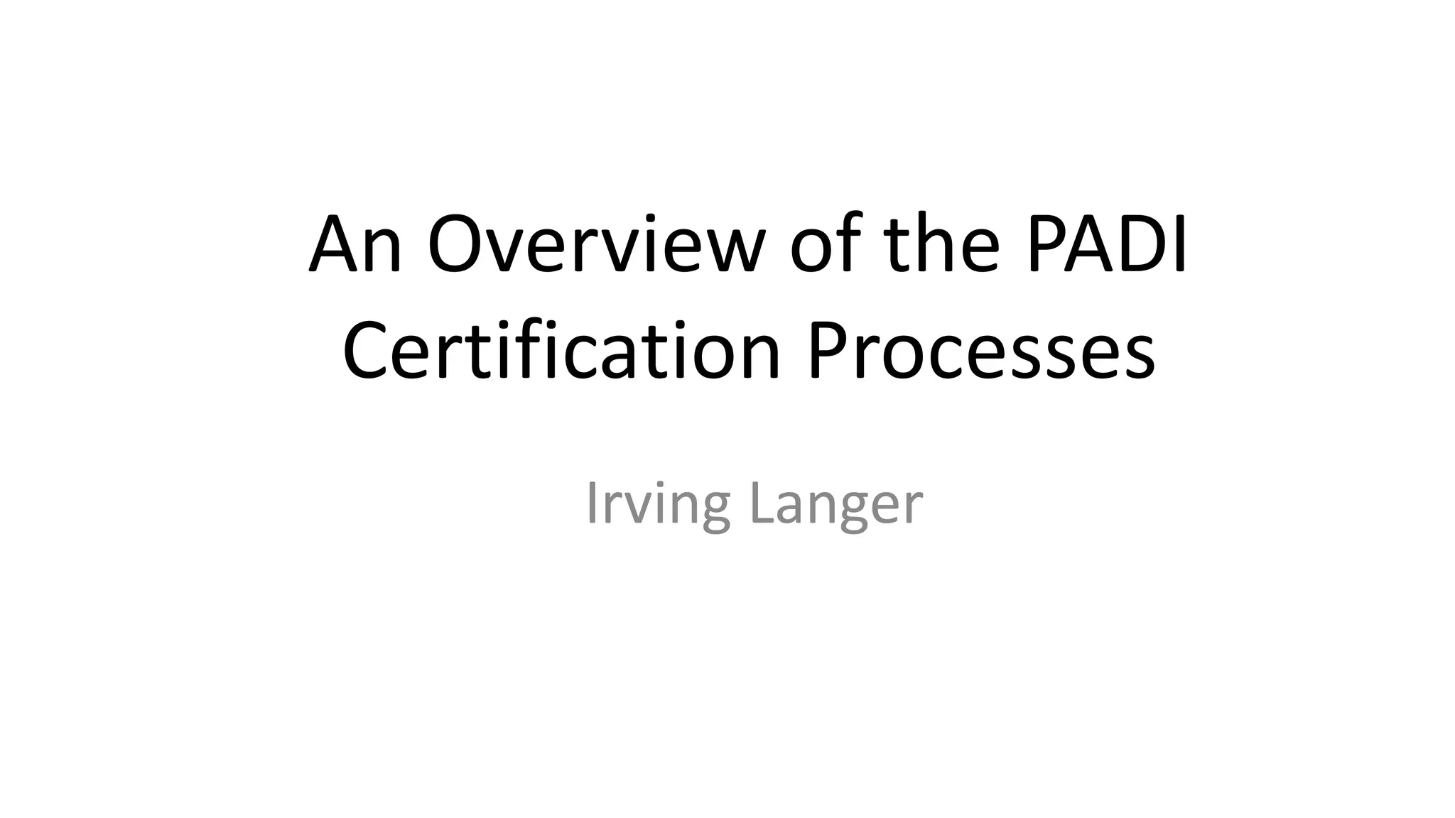 The document outlines the PADI certification process for scuba diving, detailing three primary steps: acquiring knowledge and skills through lessons, completing confined water dives, and participating in open water dives with an instructor. Individuals must learn dive planning, equipment assessment, and underwater signaling during their training. To achieve certification, they typically complete four open water dives over two days.