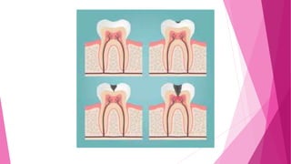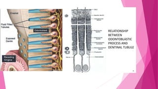 The document discusses the pulp-dentin complex. It describes dentin as the second layer of the tooth that provides structure and determines tooth shape. Dentin is a living tissue containing odontoblast processes in tubules. Dentin forms through secretion of an organic matrix followed by mineralization. Different types of dentin form throughout life. The pulp contains blood vessels, nerves and odontoblasts that form dentin. Dentin-pulp complex has sensory and protective functions.