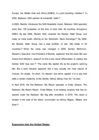 Radisson Blu is an upscale international hotel and resort brand operated by Carlson Rezidor Hotel Group, with 287 hotels globally as of December 2014. Initially branded as Radisson SAS, the name changed to Radisson Blu in 2009 after Scandinavian Airlines System withdrew as a major shareholder. The brand has expanded into the U.S. market with several notable hotel openings, including the Radisson Blu Aqua Hotel in Chicago in 2011.