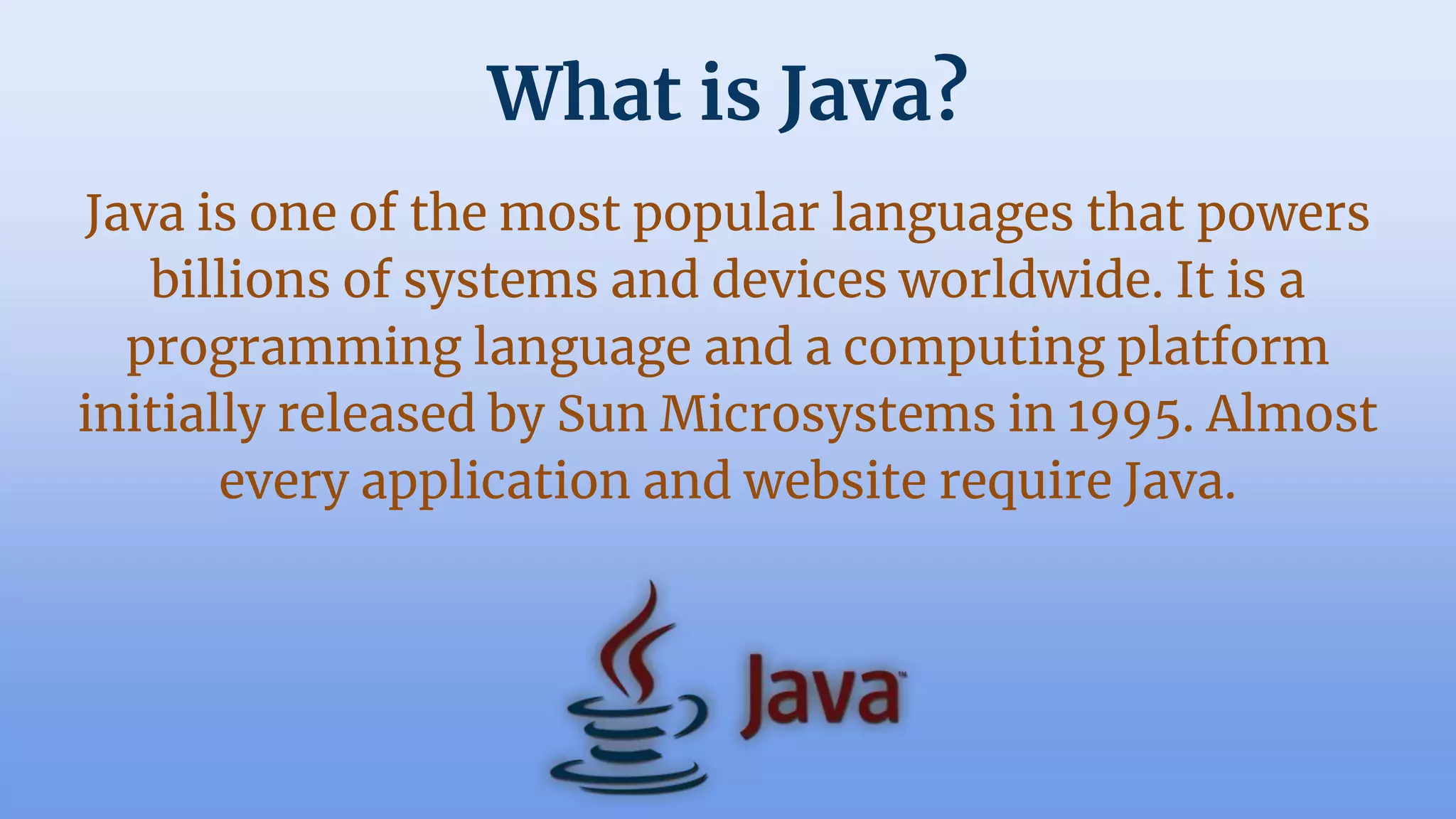 The document is a guide to Java, a popular programming language, emphasizing its flexibility and widespread use in applications and websites. It outlines the benefits of Java and presents ten real-world project examples, such as a media player, games, a messenger application, and a database explorer, showcasing various programming concepts and technologies. Additionally, it includes a promotional offer for free Java learning resources.