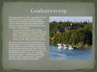 The document summarizes James Hanna's 5-day fishing trip in King Salmon, Alaska after graduating high school. On the first day, James and his family troll-fished for king salmon and caught 8 smaller fish. The second day involved fly fishing in a river and catching over 40 fish, including large chum salmon. The third day was James' favorite as they fly fished for trout and char on a remote river while being followed by grizzly bears. They built a fire and cooked their catch for a memorable meal. The fourth day surprised them with good fishing and setting up their own camp. The last day yielded only one fish before departing.