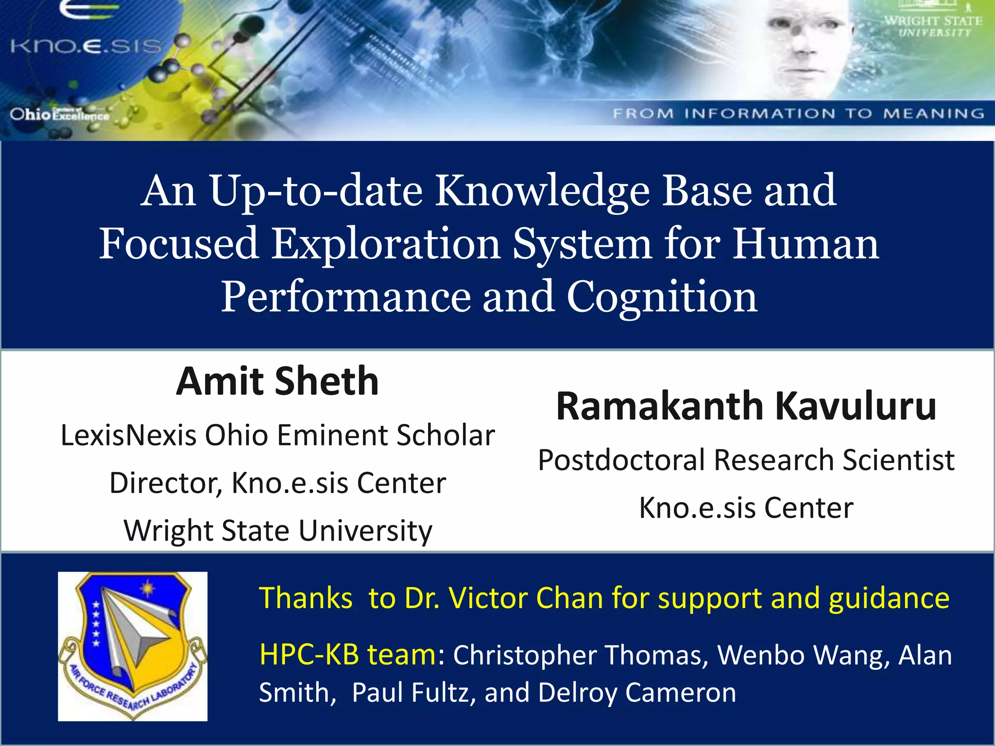 The document discusses the development of a comprehensive knowledge base (hpc-kb) aimed at enhancing human performance and cognition through structured exploration and search systems. It outlines the distinctions between knowledge bases and ontologies, emphasizing the need for dynamic updates to incorporate new scientific knowledge and relationships beyond traditional categories. Future work includes automating updates, improving the quality of the knowledge base, and utilizing advanced filtering and integration techniques to enhance user experience.