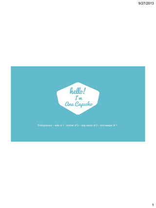 The document outlines Ana Capucho's agenda which includes introducing herself as an entrepreneur, wife, mother, and pet owner. Her agenda then lists discussing who she is, exploring the question "What? You What?", and how ideas can grow into businesses. She questions whether the reader thinks she is crazy for her entrepreneurial approach of brainstorming ideas, launching quickly, testing and reworking ideas constantly, and selling ideas before fully building them out in order to find early customers. Finally, she advocates refining ideas through numerous iterations until finding the most sellable one and thanks the reader for their time, providing her LinkedIn profile for any questions.
