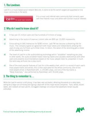 Last.fm is a music-based social network with over 21 million users. It tracks users' listening habits through its "audioscrobbling" technology and provides recommendations and charts of popular artists and songs. Last.fm generates revenue through advertising and allows users to stream full songs up to three times. Though still young, Last.fm has been successful in attracting users daily, was sold for $280 million, and signed deals with major record labels. Its main challenge is ensuring advertisers remain engaged.