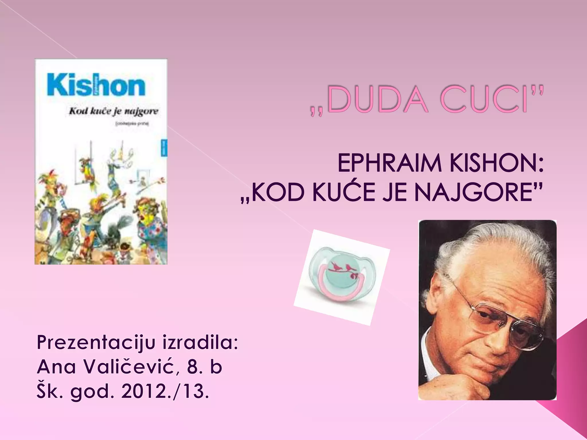 Dokument analizira humoresku 'duda cuci' autora Kishona, koja se fokusira na sitne detalje iz svakodnevnog života i probleme s djecom. Priča prati djevojčicu Renanu koja se ne može odvojiti od dude, a likovi se trude olakšati situaciju koja se dodatno komplikuje. Na kraju, ispostavlja se da je Renana zdrava i da uživa mučiti svoju obitelj, što reflektira širu temu o nedostatku roditeljske ljubavi i ponašanju djece prema roditeljima.