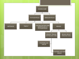 Anabolisme adalah proses pembentukan molekul kompleks dengan menggunakan energi tinggi, seperti fotosintesis dan kemosintesis. Fotosintesis adalah proses penyusunan glukosa dari H2O dan CO2 menggunakan energi cahaya, terdiri atas reaksi terang dan gelap. Kemosintesis juga menyusun glukosa tetapi menggunakan energi dari reaksi kimia, bukan cahaya.