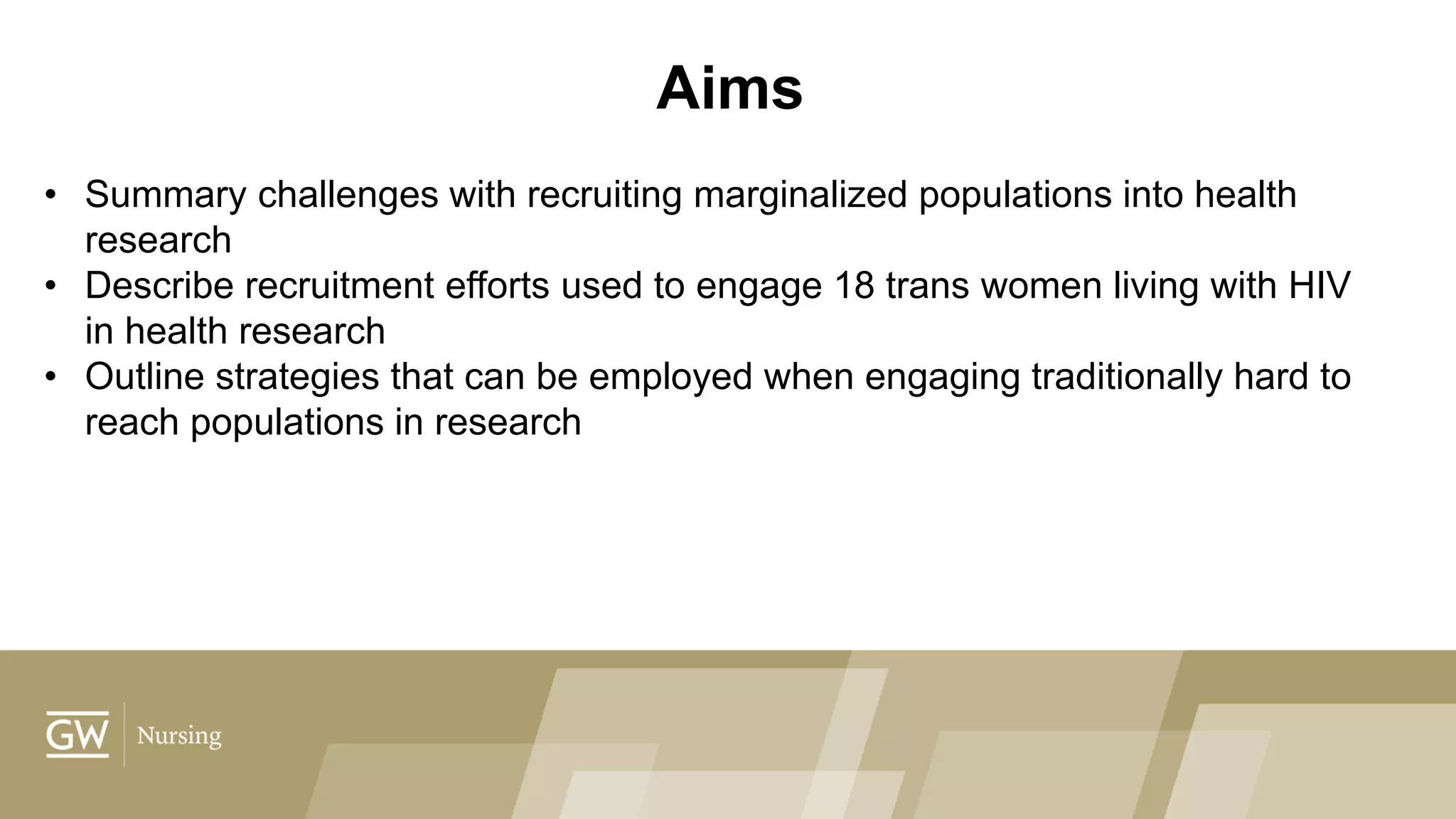 Community-engaged approaches were used to recruit 18 transgender women living with HIV in Indiana for a research study. The recruitment process took 21 months and involved partnering with community organizations, advisory boards, and community leaders. Most participants were referred by recruitment sites and community advisory board members, highlighting the importance of community engagement. The study found that relationship-building, giving back to the community, and addressing issues of importance to transgender women were key to overcoming barriers to research participation.