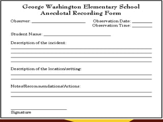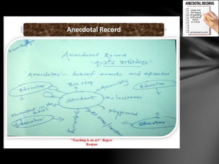 The document discusses anecdotal records as a tool in educational psychology used for systematic observation and documentation of significant incidents in student behavior. It outlines the characteristics, purposes, and both advantages and disadvantages of anecdotal records, emphasizing their role in tracking student development and instructional needs. The record should include factual details about incidents, and while relatively easy to do, their reliability may be compromised by the observer's memory and potential bias.