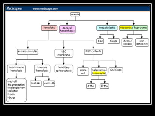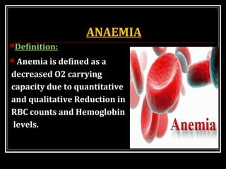 This document discusses anemia, specifically iron deficiency anemia and megaloblastic anemia. It defines anemia and provides classifications. It then describes iron metabolism, daily iron requirements, sources of iron, and factors affecting iron absorption. It discusses the causes, clinical features, laboratory findings, and management of iron deficiency anemia and megaloblastic anemia. Key points covered include the role of vitamin B12 and folic acid in megaloblastic anemia, and morphological and etiological classifications of anemia.