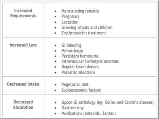 - The main types of anemia are microcytic (small RBCs), macrocytic (large RBCs), and normocytic (normal sized RBCs). Common causes include iron deficiency, vitamin B12/folate deficiency, and aplastic anemia.