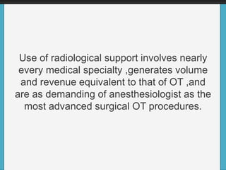 This document discusses the unique constraints anesthesiologists face when providing care in radiology settings rather than traditional operating rooms. It notes that radiological procedures generate significant volume and revenue, and require the same attention to efficiency, planning, and consistency as major surgeries. The document outlines general constraints like equipment limitations, monitoring challenges, and communication barriers in radiology suites. It also provides anesthesia considerations and approaches for specific radiological procedures like CT, MRI, cath lab cases, and interventional radiology.