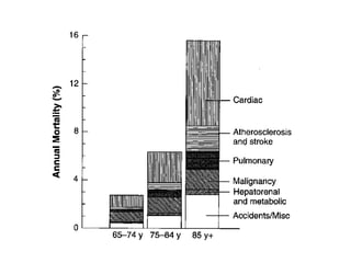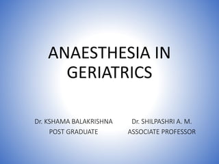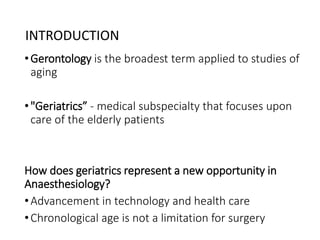 The document provides information on anaesthesia considerations in geriatric patients. It discusses how the aging process impacts various body systems including cardiovascular, respiratory, nervous and renal systems. Key points include decreased organ reserve, altered pharmacokinetics/dynamics requiring adjusted drug dosing, and increased risk of complications. A thorough pre-op assessment of patient health and functional status is important to reduce risks and optimize care for the elderly undergoing surgery.