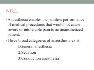 Anaesthesia enables medical procedures to be performed painlessly by suppressing central nervous system activity through general anaesthesia, producing a state of calm through sedation, or blocking nerve impulses regionally through conduction anaesthesia. The anaesthetic machine provides a controlled mixture of gases and vapors for inhalation, and includes a gas delivery system, breathing circuit, ventilator, and monitors. It must carefully control anaesthetic concentration, carbon dioxide levels, oxygen consumption, and atmospheric pollution during a procedure.