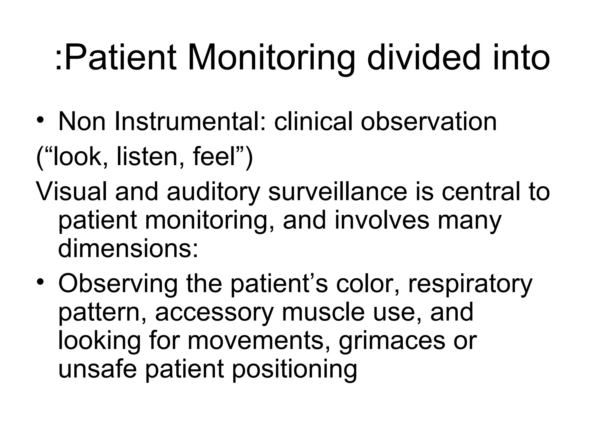 Patient monitoring involves both non-instrumental and instrumental assessment. Non-instrumental monitoring includes visual observation of factors like respiratory pattern, bleeding, and IV lines. Instrumental monitoring provides quantitative data through devices like ECG, blood pressure cuffs, pulse oximetry, capnography, and muscle relaxation monitors. Together, non-instrumental and instrumental monitoring provide clinicians with vital information about patients' physiological status to guide care in settings like operating rooms and intensive care.