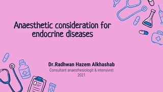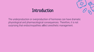 This document discusses endocrine diseases and their implications for anesthesia. It covers both hyperthyroidism and hypothyroidism in detail. For hyperthyroidism, it describes the signs and symptoms, causes, effects on the cardiovascular system, and treatment approaches including antithyroid medications, beta blockers, iodine, and surgery. It provides guidance on preoperative preparation and intraoperative management. For hypothyroidism, it discusses signs and symptoms, effects on the cardiovascular system, diagnosis, and treatment with levothyroxine. It notes risks for anesthesia and importance of rendering patients euthyroid prior to elective surgery.