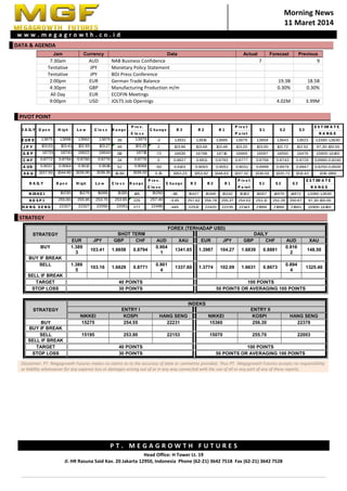 This document contains a daily news report and market data from an Indonesian financial services company. It provides currency exchange rates and economic indicators for the day. It also outlines buy and sell strategies for various currencies and stock indices, including entry and exit price targets and stop loss levels.