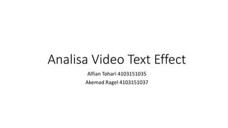Dokumen tersebut berisi analisis efek teks pada dua video. Pada video pertama, teks dimunculkan dengan mengubah skala, posisi, dan blur motion. Pada video kedua, teks dimunculkan dengan mengubah posisi, rotasi, opasitas, dan pre-composing teks di dalam bentuk persegi. Kedua video memanfaatkan berbagai efek seperti skala, posisi, rotasi, dan opasitas untuk menampilkan dan menghilangkan teks secara gradual.