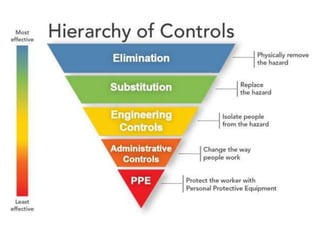 Dokumen tersebut membahas tentang analisis dan pengendalian resiko kerja di lingkungan kerja. Ia menjelaskan tentang identifikasi potensi bahaya yang dapat timbul dari berbagai sumber seperti bahan kimia, listrik, mekanik, dan lainnya. Dokumen ini juga menjelaskan teknik untuk mengidentifikasi potensi bahaya tersebut secara proaktif agar dapat mencegah terjadinya kecelakaan kerja. Langkah-langkah