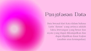 Dokumen tersebut membahas tentang analisis data, penjelasan data dan satuan ukuran data, penjelasan analisis dan interpretasi data, tujuan analisis data, dan pengenalan perkakas Microsoft Excel seperti worksheets, freeze panes, cell references, dan format cells.