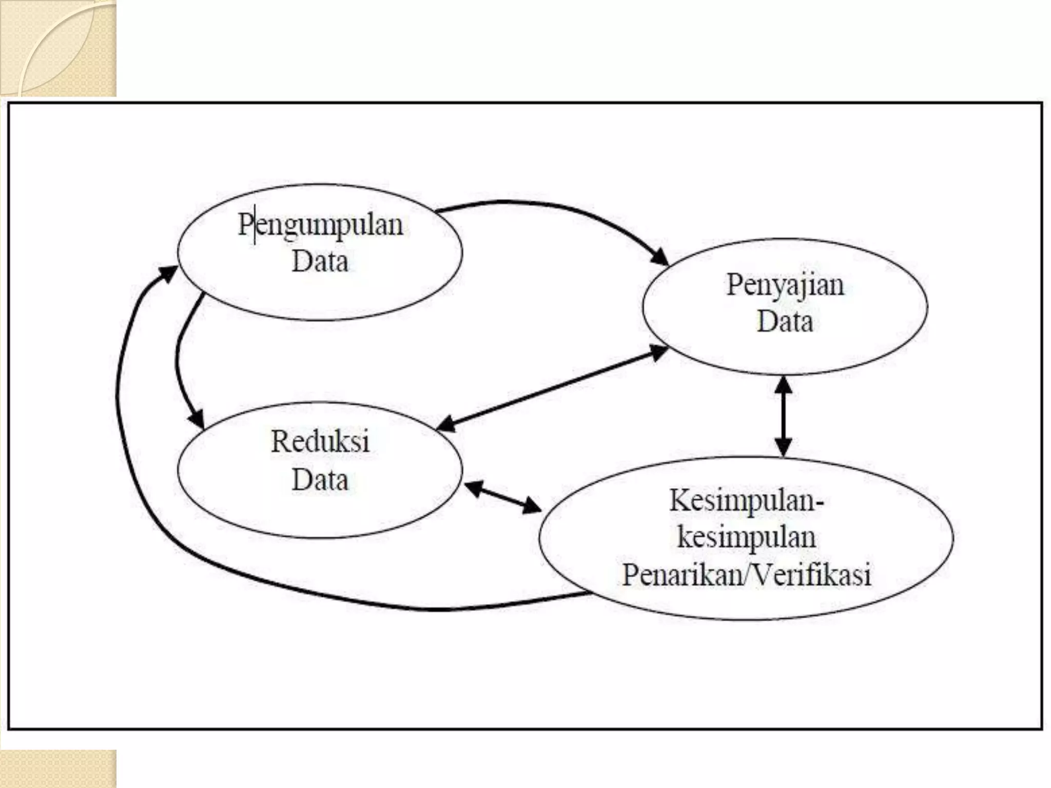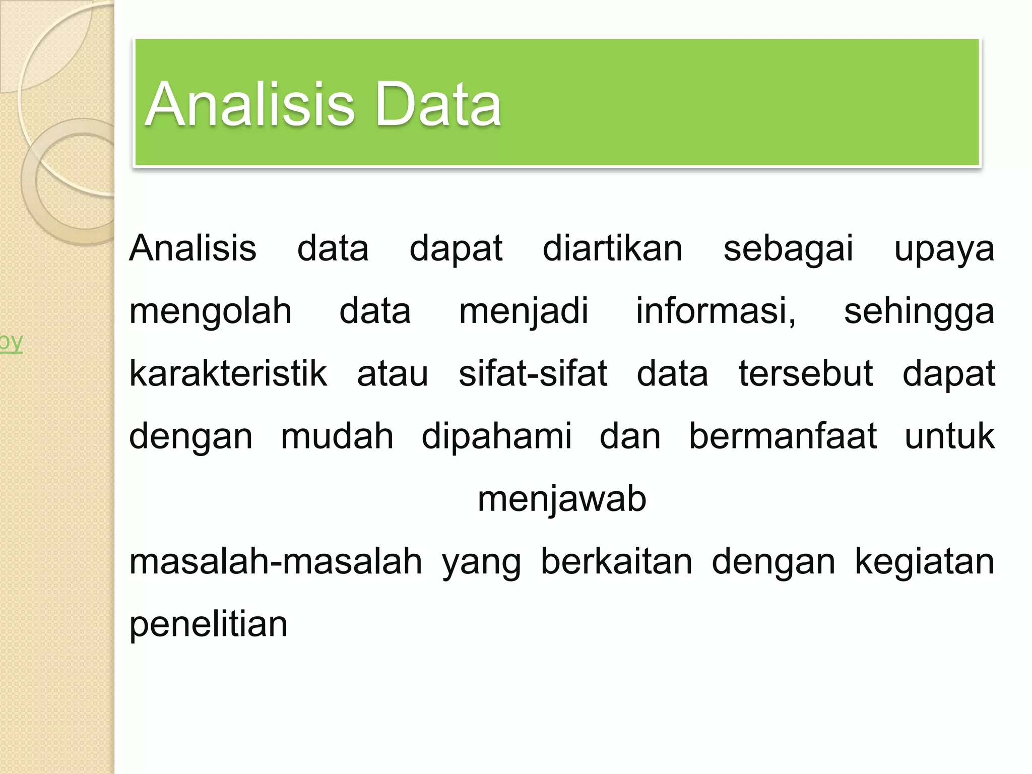 Analisis data bertujuan untuk mengubah data menjadi informasi yang berguna untuk menjawab masalah penelitian. Langkah-langkahnya meliputi persiapan, tabulasi, dan penerapan data. Model analisis interaktif Miles dan Huberman melibatkan reduksi data, penyajian data, dan penarikan kesimpulan secara berkelanjutan selama penelitian. Content analysis merupakan metode analisis isi teks secara mendalam.