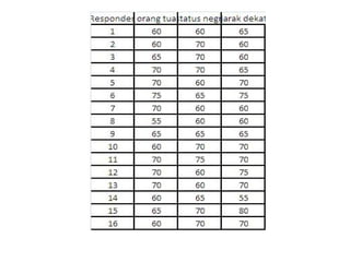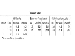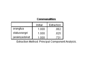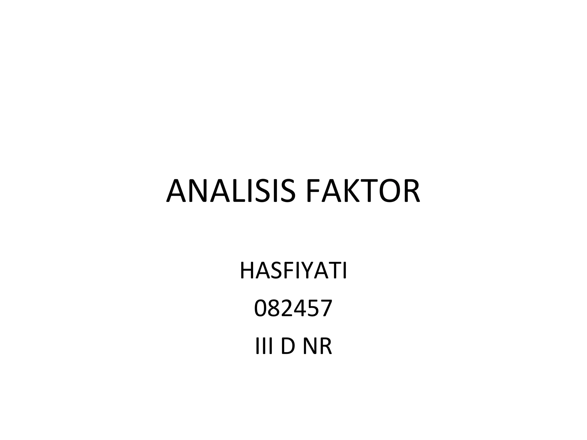 Analisis faktor adalah metode statistik yang digunakan untuk mereduksi dimensi data dengan menjelaskan keragaman variabel melalui sejumlah faktor utama. Proses ini melibatkan identifikasi hubungan antar variabel, di mana faktor yang dihasilkan harus mampu menangkap informasi secara maksimal tanpa kehilangan makna. Metode ini juga melibatkan teknik seperti Bartlett's test of sphericity dan analisis eigenvalue untuk menentukan relevansi faktor dalam model.