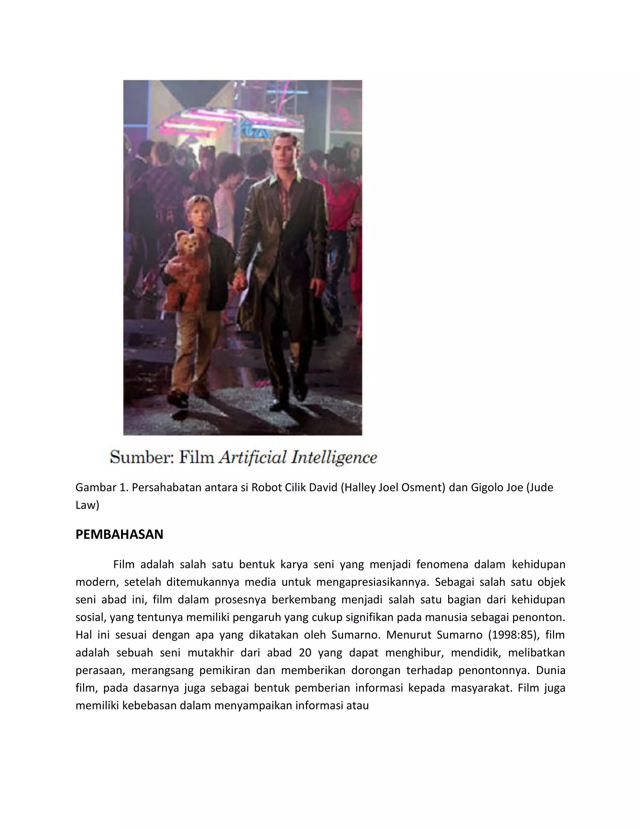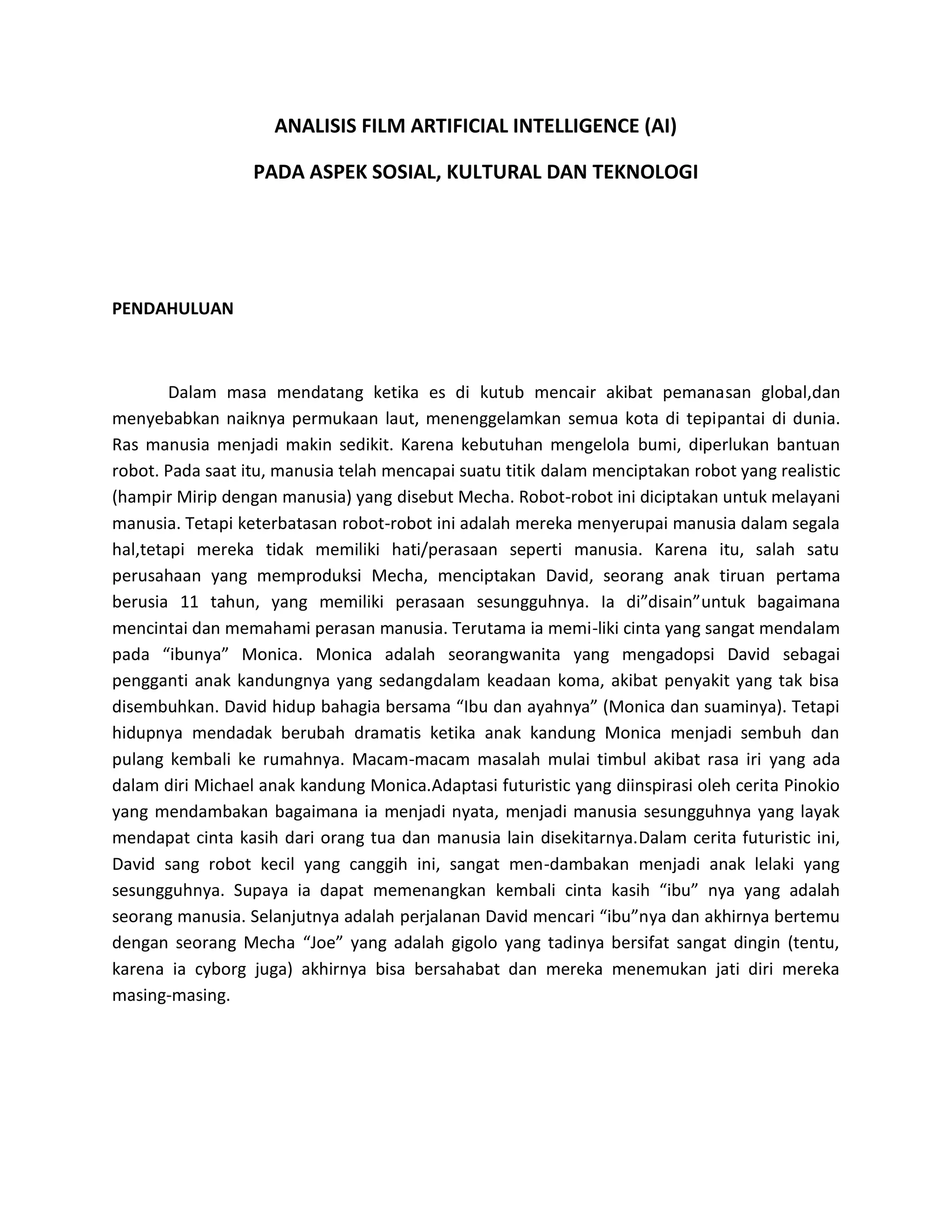 Film Artificial Intelligence menggambarkan perjalanan robot cilik bernama David yang mencari cinta sebagai manusia. David mencari ibunya dan bertemu dengan robot lain bernama Joe. Bersama Joe, David belajar tentang identitasnya sebagai robot dan manusia. Film ini mengeksplorasi hubungan antara manusia dan teknologi serta konsep kemanusiaan.