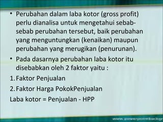 Dokumen ini membahas analisis laba kotor, yang dipengaruhi oleh perubahan harga jual dan volume penjualan. Empat faktor penyebab perubahan laba kotor diidentifikasi: variasi harga jual, variasi volume penjualan, variasi harga pokok penjualan per unit, dan variasi volume harga pokok penjualan. Analisis ini penting untuk memahami dampak keuntungan atau kerugian dari perubahan tersebut.