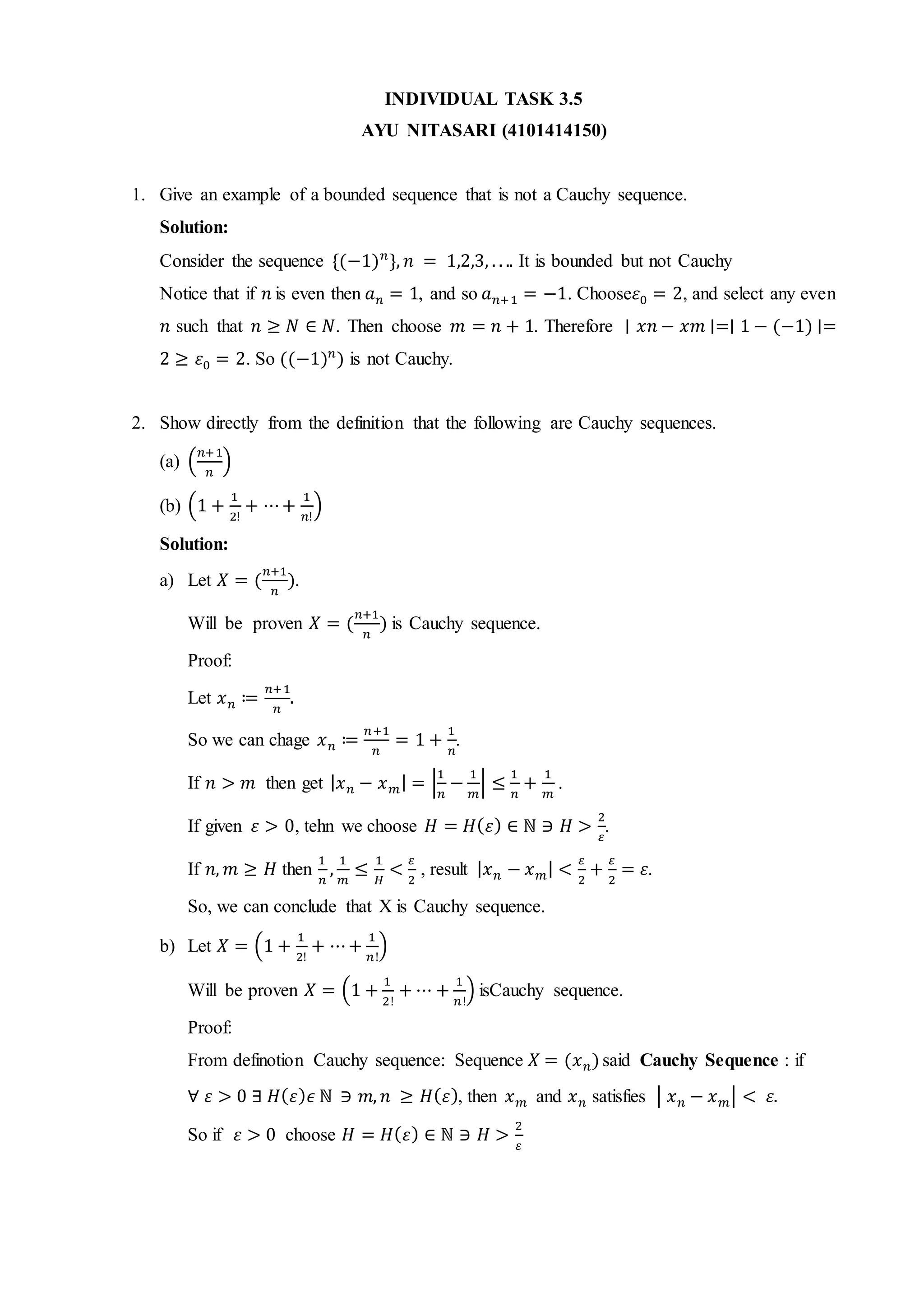 2) It shows that the sequences (n+1/n) and (1 + 1/2! + ... + 1/n!) are Cauchy using the definition.