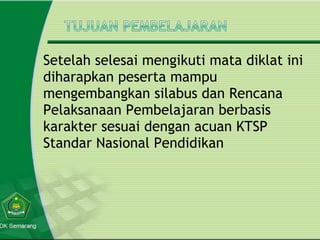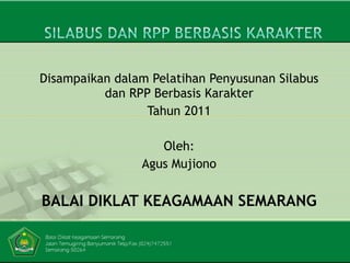 Dokumen ini merupakan ringkasan dari pelatihan penyusunan silabus dan RPP berbasis karakter tahun 2011. Pelatihan ini bertujuan agar peserta mampu mengembangkan silabus dan RPP sesuai standar nasional pendidikan. Dokumen ini mengidentifikasi kendala guru dalam menyusun silabus dan RPP serta memberikan saran perbaikan.