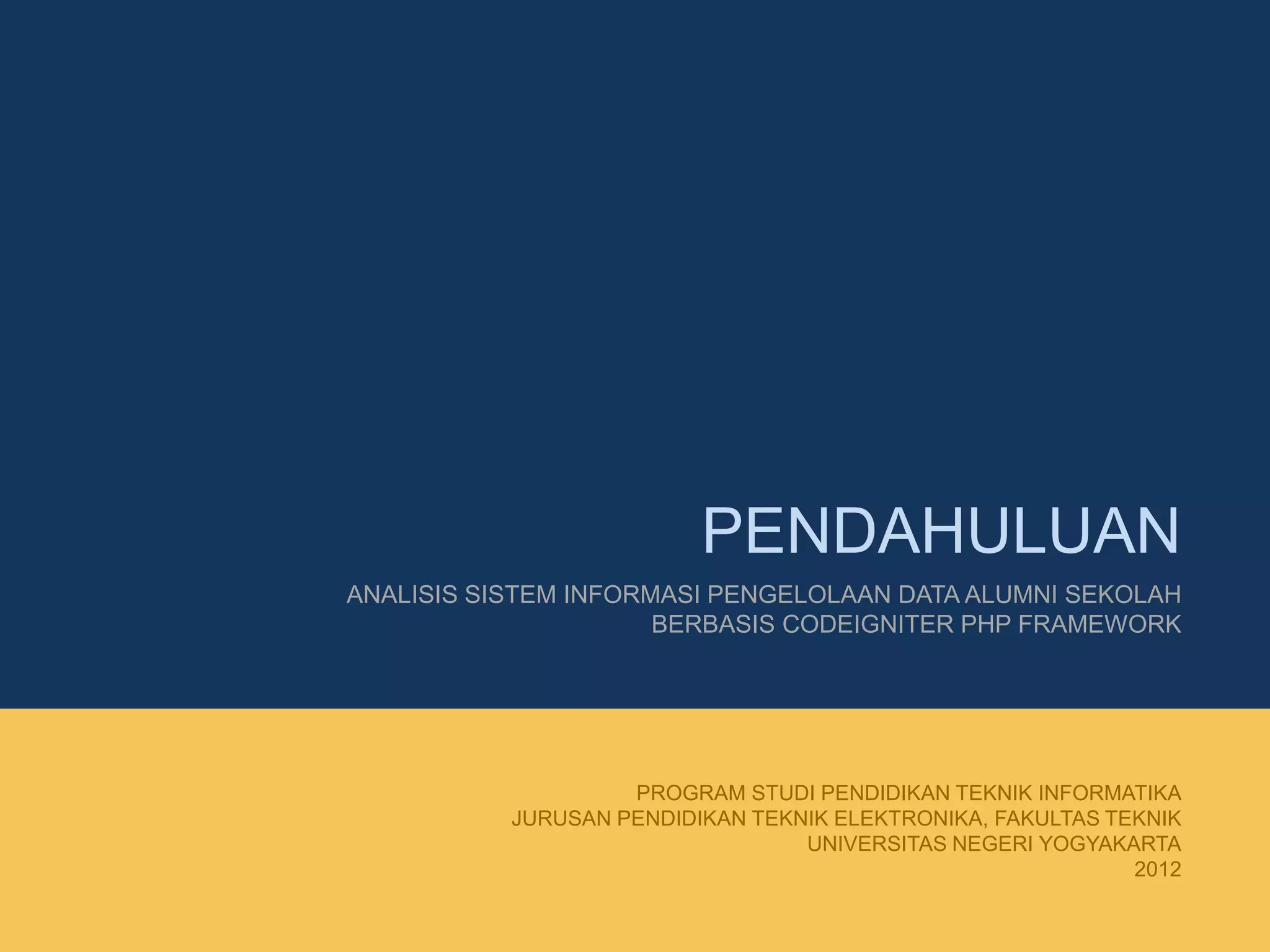 Sistem informasi pengelolaan data alumni sekolah berbasis CodeIgniter dapat meningkatkan pengelolaan data secara digital dan online. Sistem ini memiliki fitur untuk penambahan, penyuntingan, pencarian, dan cetak data alumni secara mandiri oleh sekolah maupun alumni. Sistem ini juga telah diuji memenuhi standar keamanan, kinerja, dan kemudahan penggunaan.