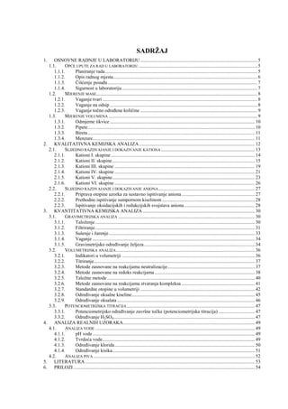 Dokument opisuje analitičku kemiju i njezine metode, uključujući kvalitativne i kvantitativne analize. Opišete osnovne laboratorijske radnje, kao što su mjerenje mase i volumena, te postupke analize kationa i aniona. Također se naglašava značaj kemijske analize u industriji i zaštiti okoliša.