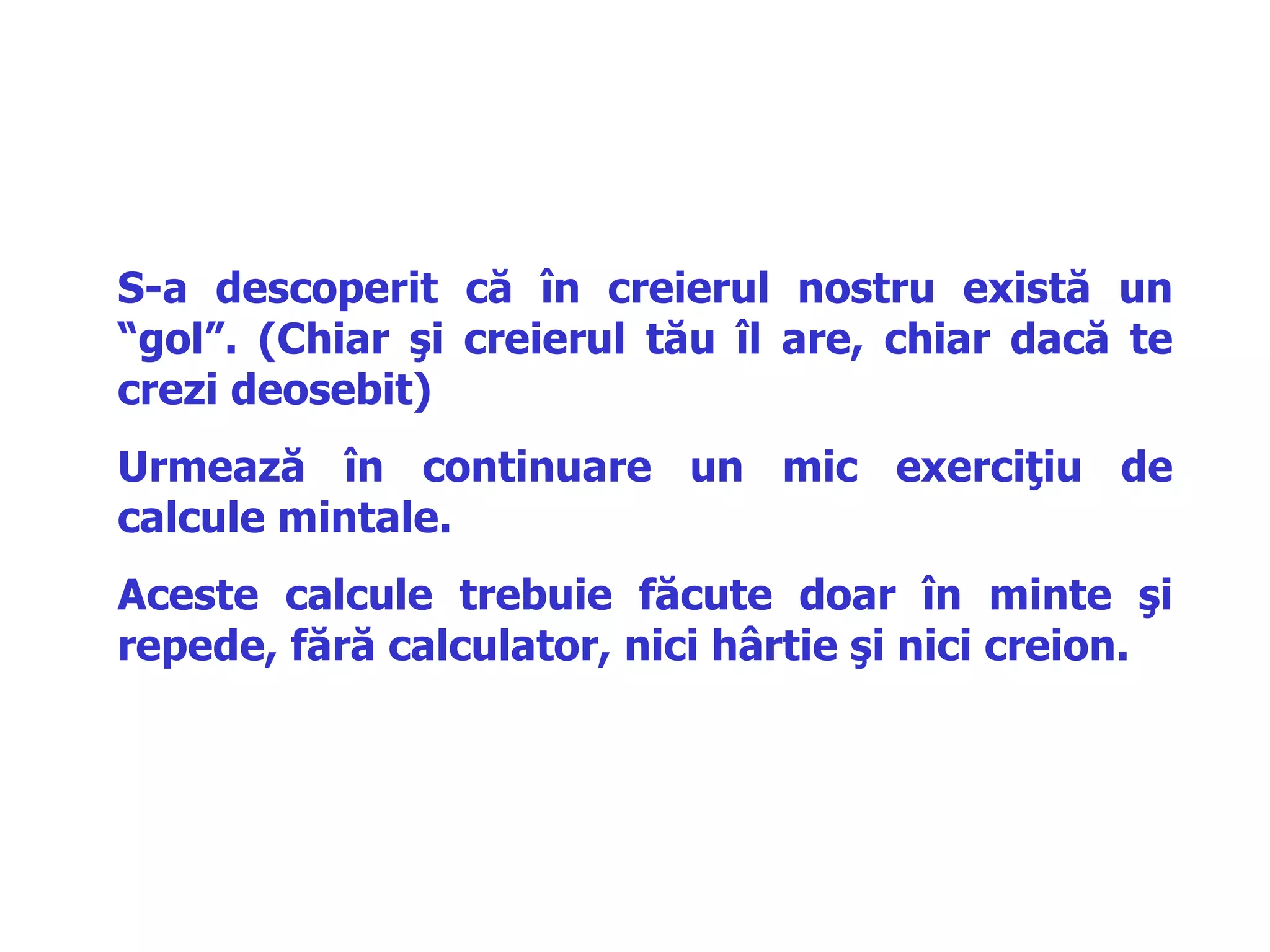 Documentul prezintă un exercițiu mental prin care se scot în evidență limitările creierului uman în procesarea informațiilor. Exercițiile propuse implică adunări rapide și numărarea literelor dintr-un text specific, rezultatul fiind o evidențiere a capacității cognitive. Se sugerează că majoritatea oamenilor răspund conform unui tipar obișnuit, iar unii pot gândi diferit, evidențiind o formă de normalitate în gândire.
