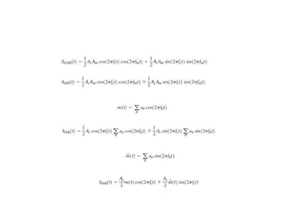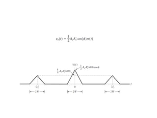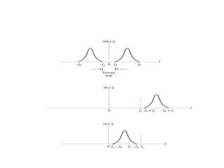 1. The document discusses amplitude modulation (AM) techniques such as AM double sideband full carrier (AMDSB-FC), AM double sideband suppressed carrier (AMDSB-SC), and single sideband (SSB) modulation.