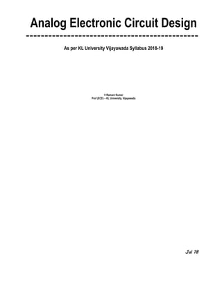 This document describes the basics of analog electronic circuit design, specifically focusing on diodes, transistors, operational amplifiers, and oscillators. It begins by explaining semiconductor theory, including atomic structure, electron and hole dynamics, and the creation of n-type and p-type semiconductors through doping. It then discusses pn junctions, including diffusion, the depletion region, and forward and reverse biasing. The document outlines diode characteristics and applications such as rectifiers and regulators. It also covers bipolar junction transistors, field effect transistors, operational amplifiers, and oscillator circuits. The overall purpose is to address the gap between industry expectations and academic objectives for analog circuit design.