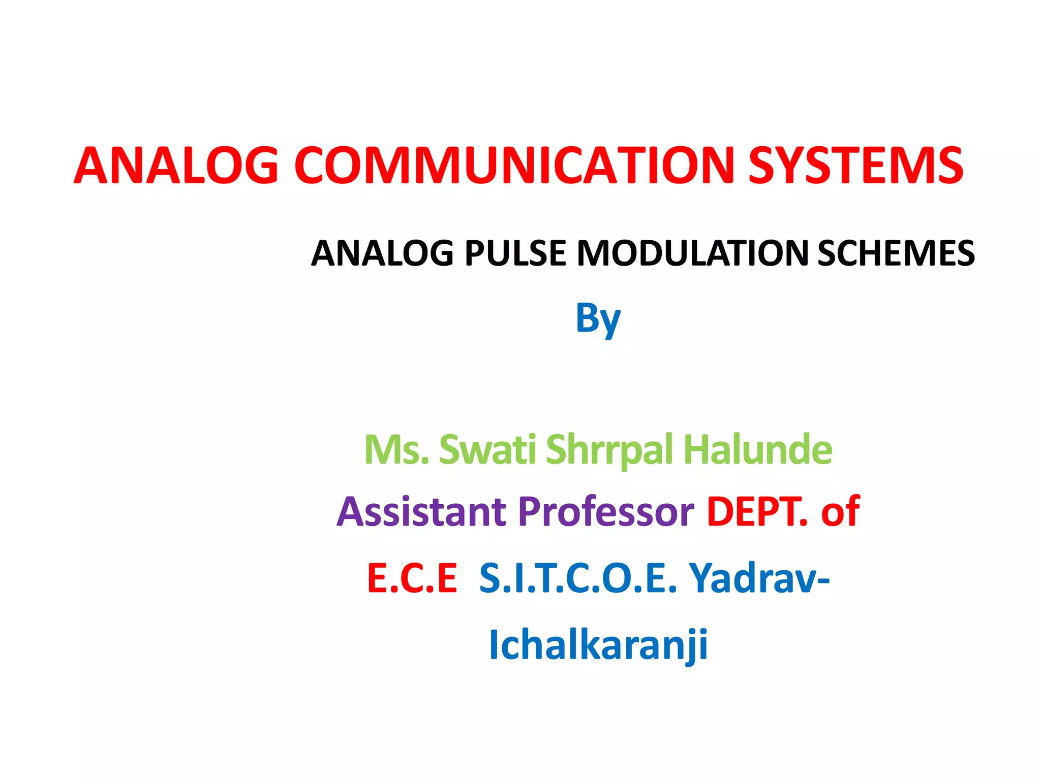 This document discusses various analog pulse modulation schemes, including pulse amplitude modulation (PAM), pulse width modulation (PWM), and pulse position modulation (PPM). PAM varies the amplitude of pulses in a carrier signal based on the modulating signal. PWM varies the width of pulses, while PPM varies the position of pulses. The document describes the generation and demodulation of these different modulation types. It also discusses sampling theory and the advantages and disadvantages of PAM.