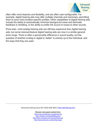 The document explains the differences between analog and digital hearing aids, detailing their history and functionality. While analog aids amplify sound directly, digital aids convert sound waves into binary code for sophisticated processing before amplifying them. Digital hearing aids typically offer more features, programmability, and flexibility, although analog aids remain less expensive and some users may prefer them.