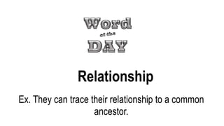 The document discusses the concept of analogies and provides examples of different types of analogy relationships. It defines an analogy as comparing words or concepts based on how they are alike or related. It then outlines 6 basic categories of analogy relationships: 1) pair relationships, 2) opposites, 3) synonyms, 4) characteristics, 5) function or purpose, and 6) product and raw material. For each category it provides examples and asks the reader to identify the relationship in example analogies.